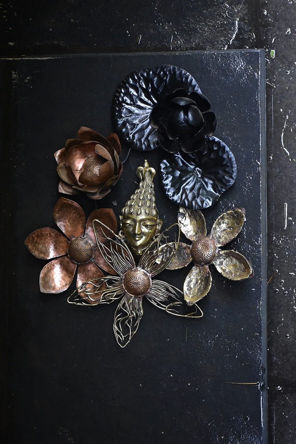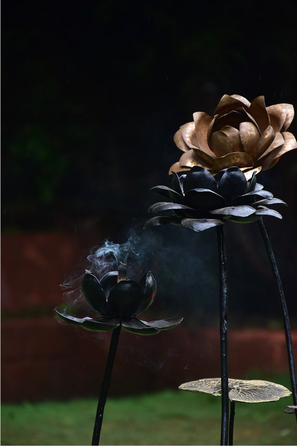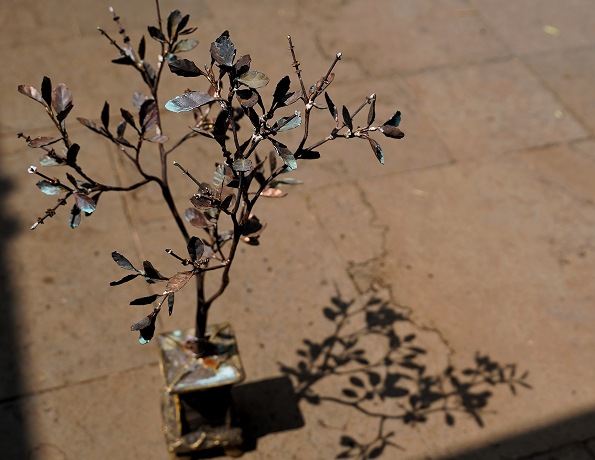 The process involves shaping a sheet of metal (we work in iron, copper or brass) by heating it and then beating it with a hammer. It often takes a combination of multiple sheet metal processes – embossing, repousse, bending and shaping, welding etc – to get the final form.