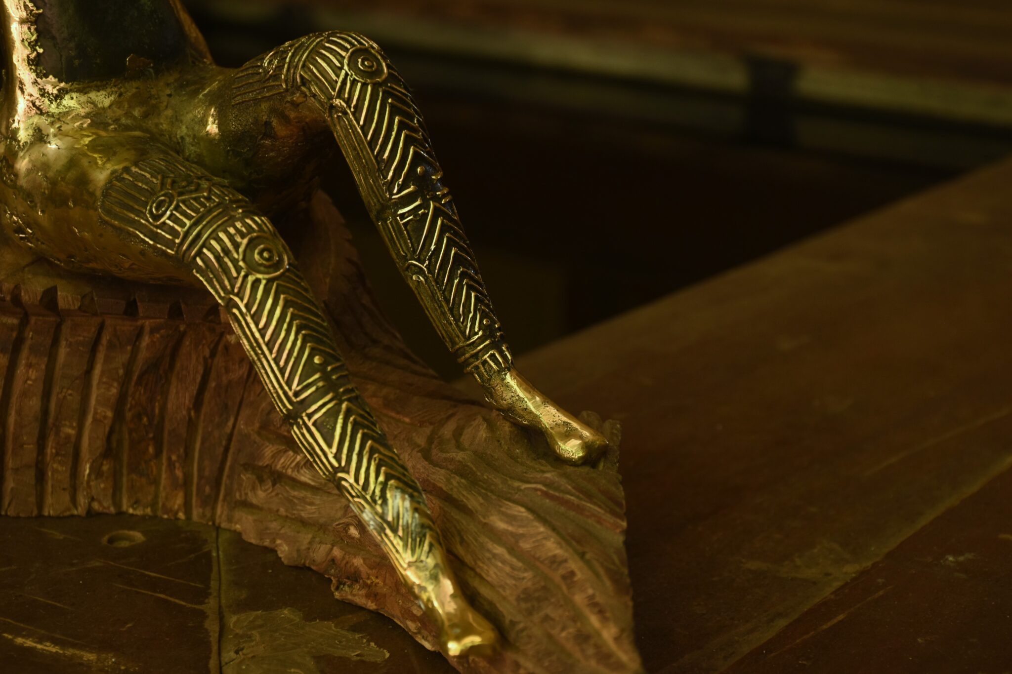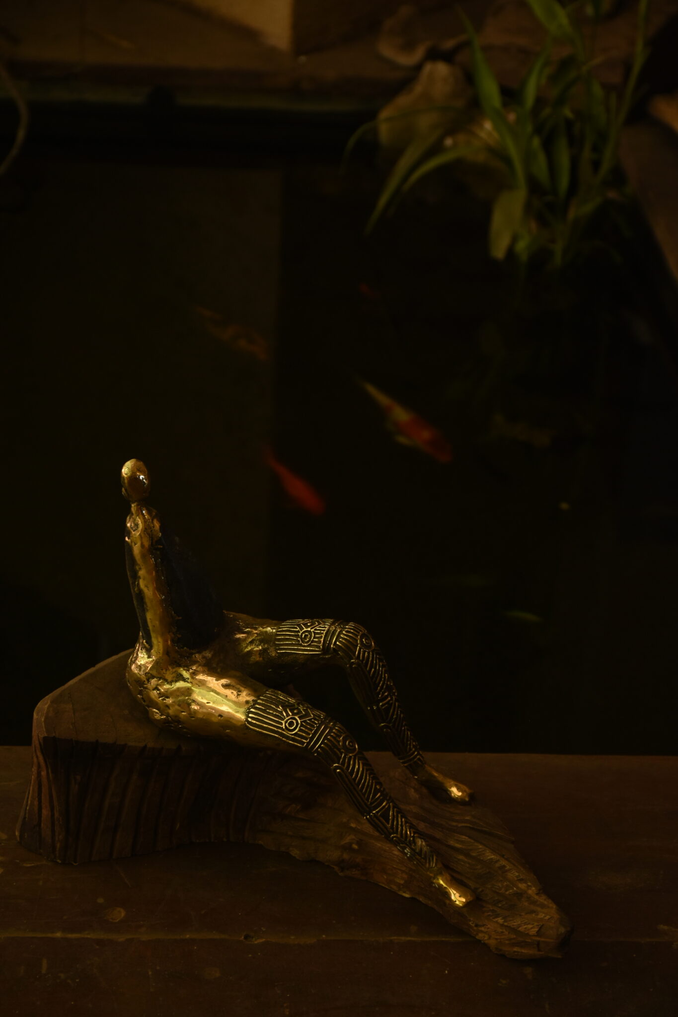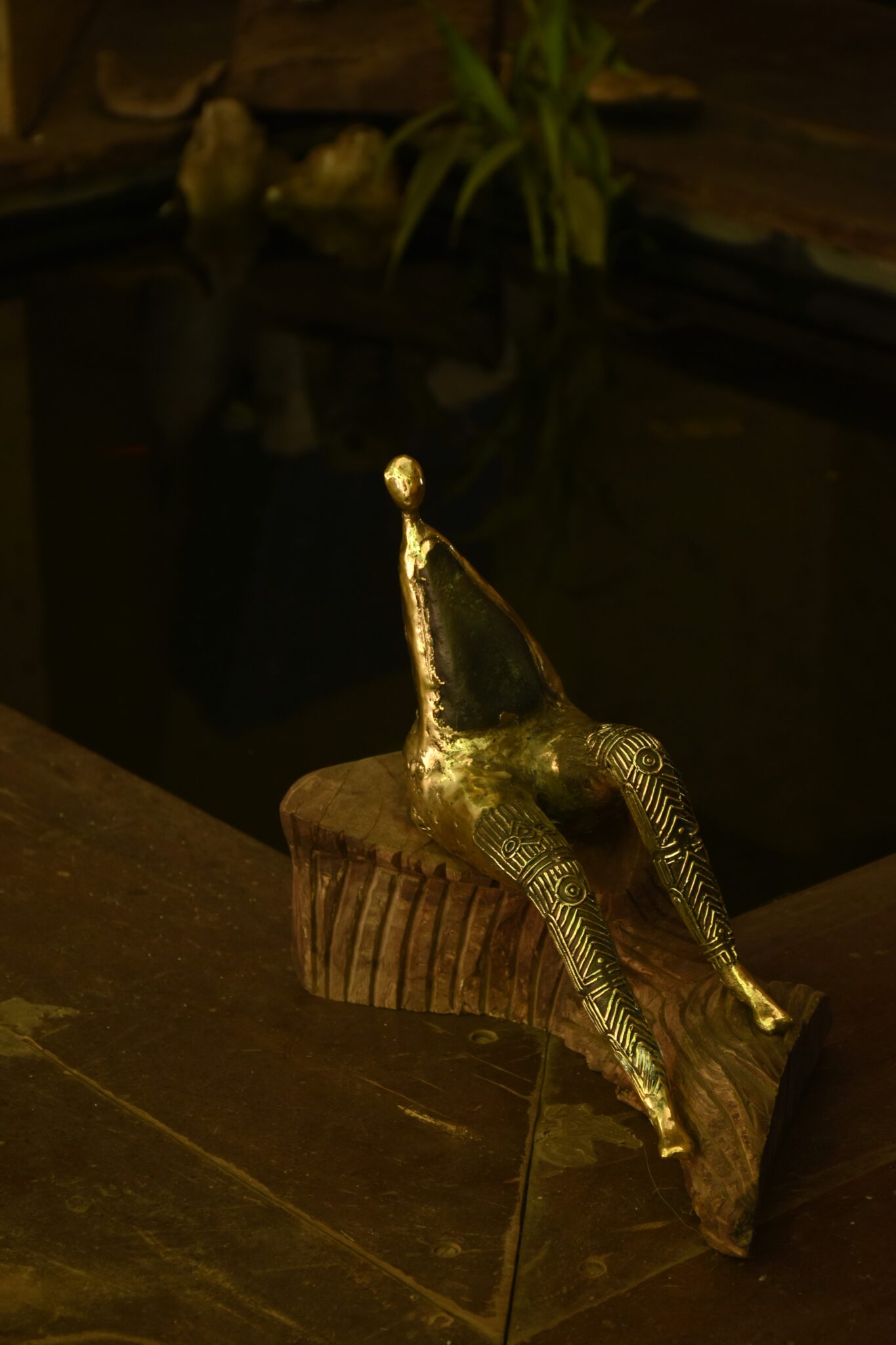 This sculpture, made in Rock-Dhokra, pays homage to the intricate Godna tattoos of the Baiga tribe from central India. The designs etched on various parts of her body narrate her journey through life, marking milestones such as puberty, marriage and motherhood. These tattoos, far beyond mere adornment are symbols and language of our culture.