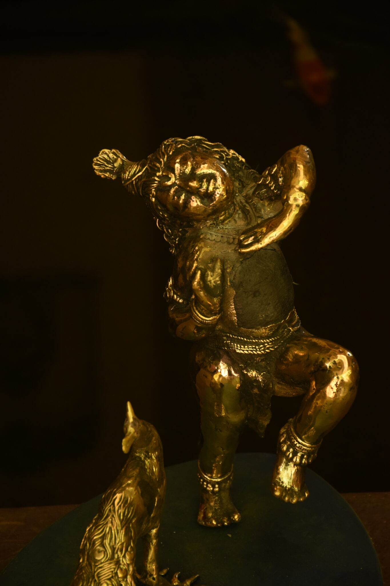 Here Krishna and the peacock are both made in Rock Dhokra, standing on a carved wooden base.