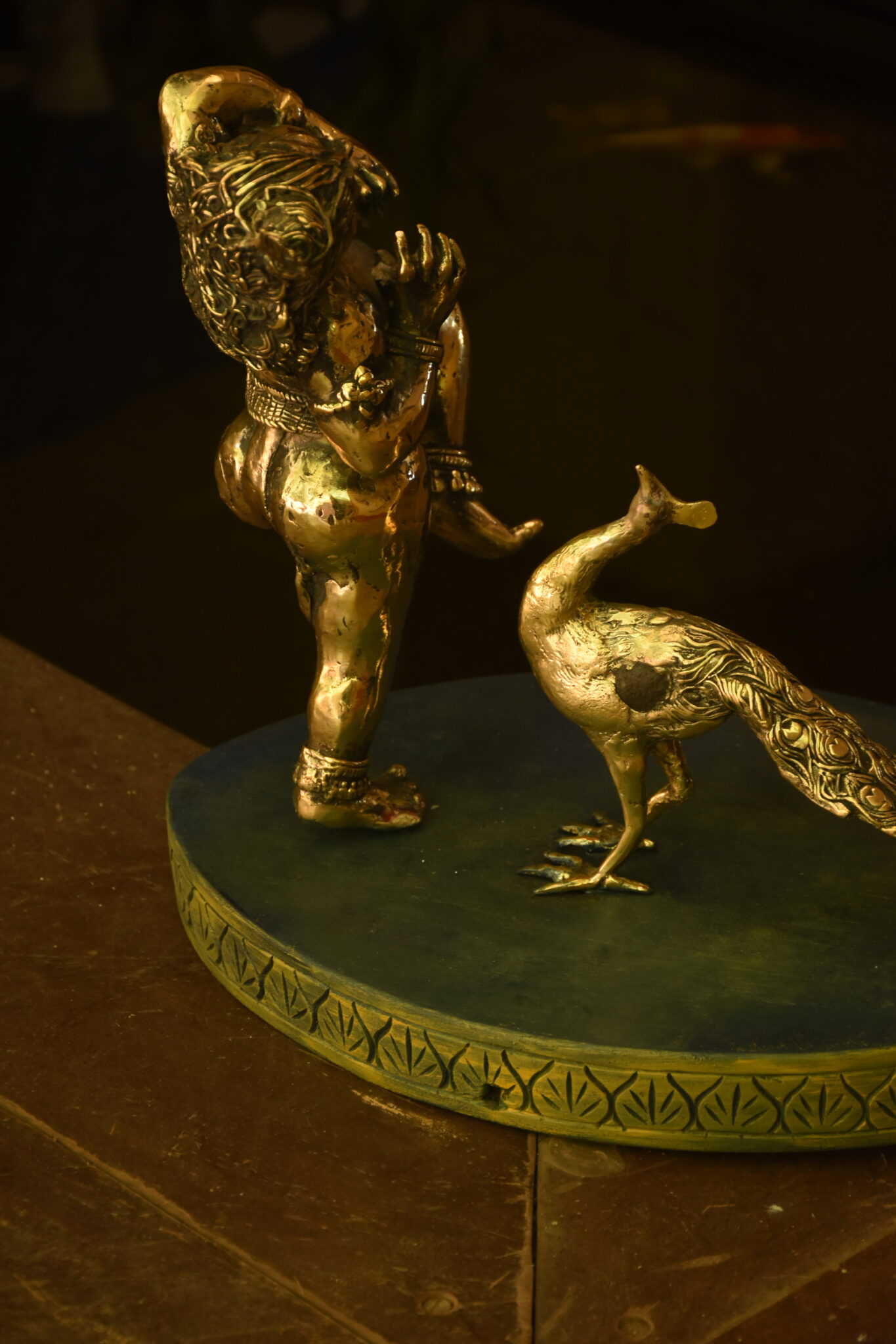 Krishna Leela- for us humans to relate to the divine, sometimes God even takes the form of a playful child. Here, the peacock also joins him in his dance!