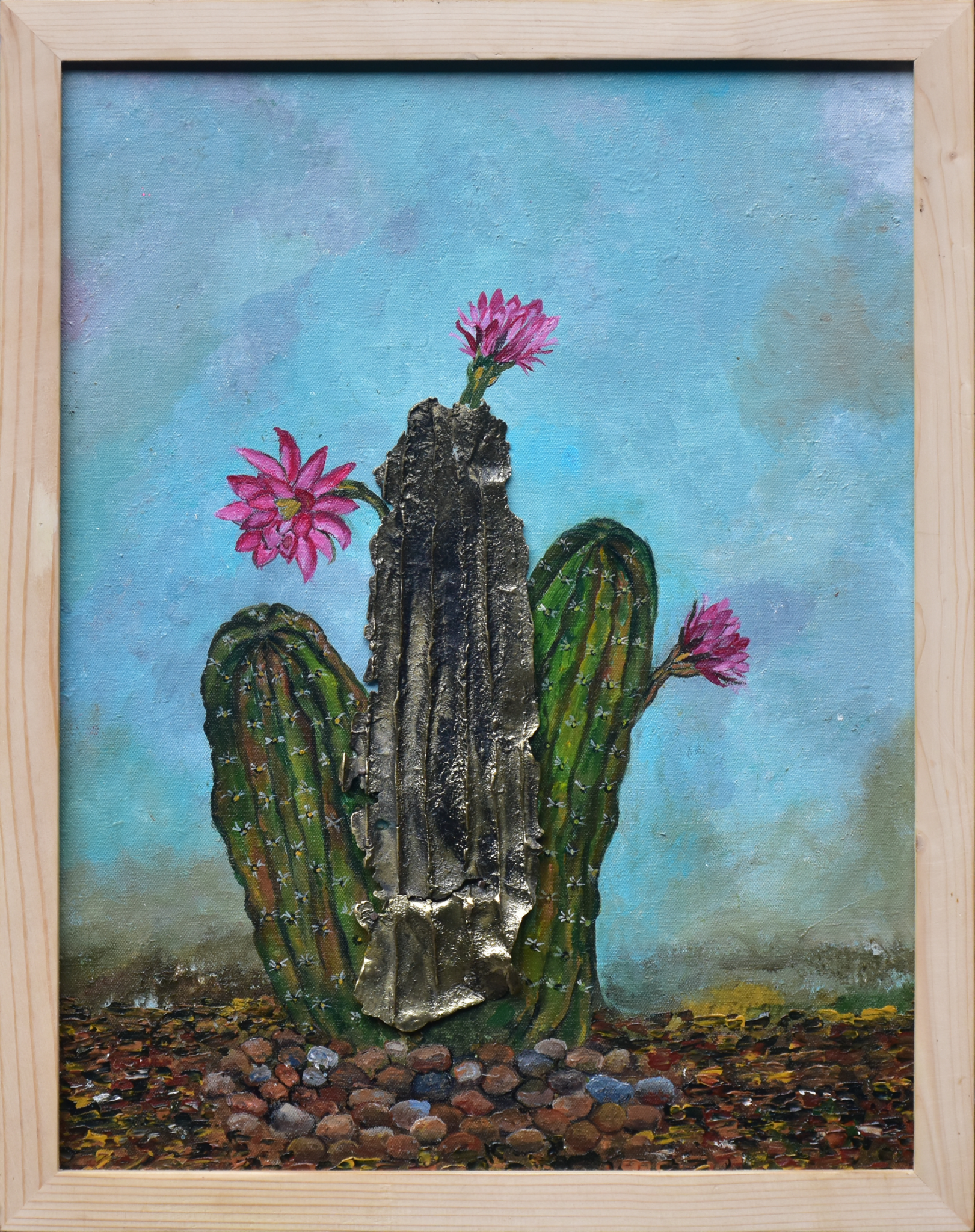 This cactus painting is inspired by the metal piece used in it. It is handcrafted and cast in brass using the lost wax technique of metal casting. It happens sometimes that the casting of a piece is unsuccessful, and only part of it survives. While that one piece fails, it inspires us to create something new with it. This is one such piece, where the metal piece was part of a failed casting, but found new meaning in this painting!