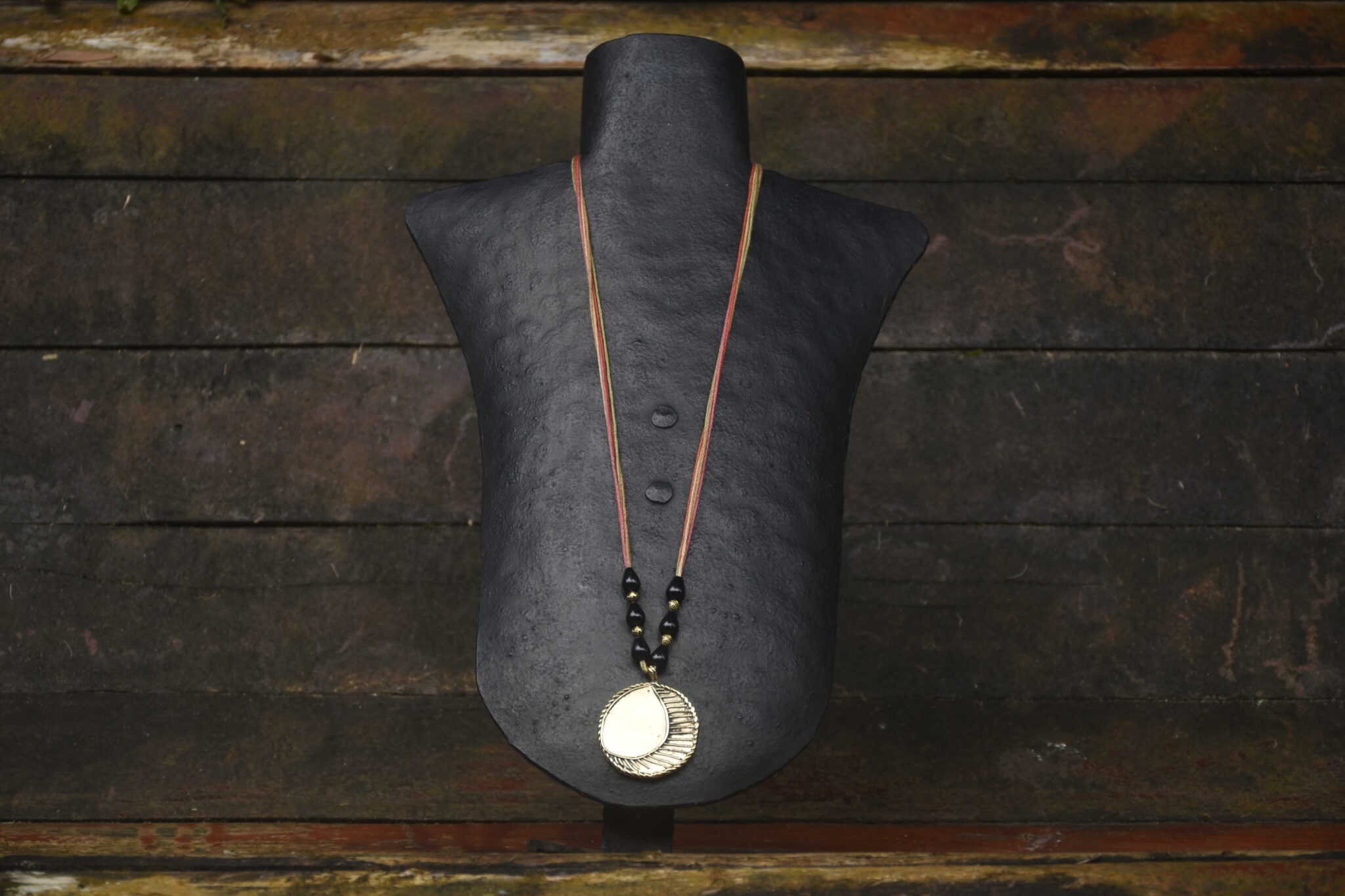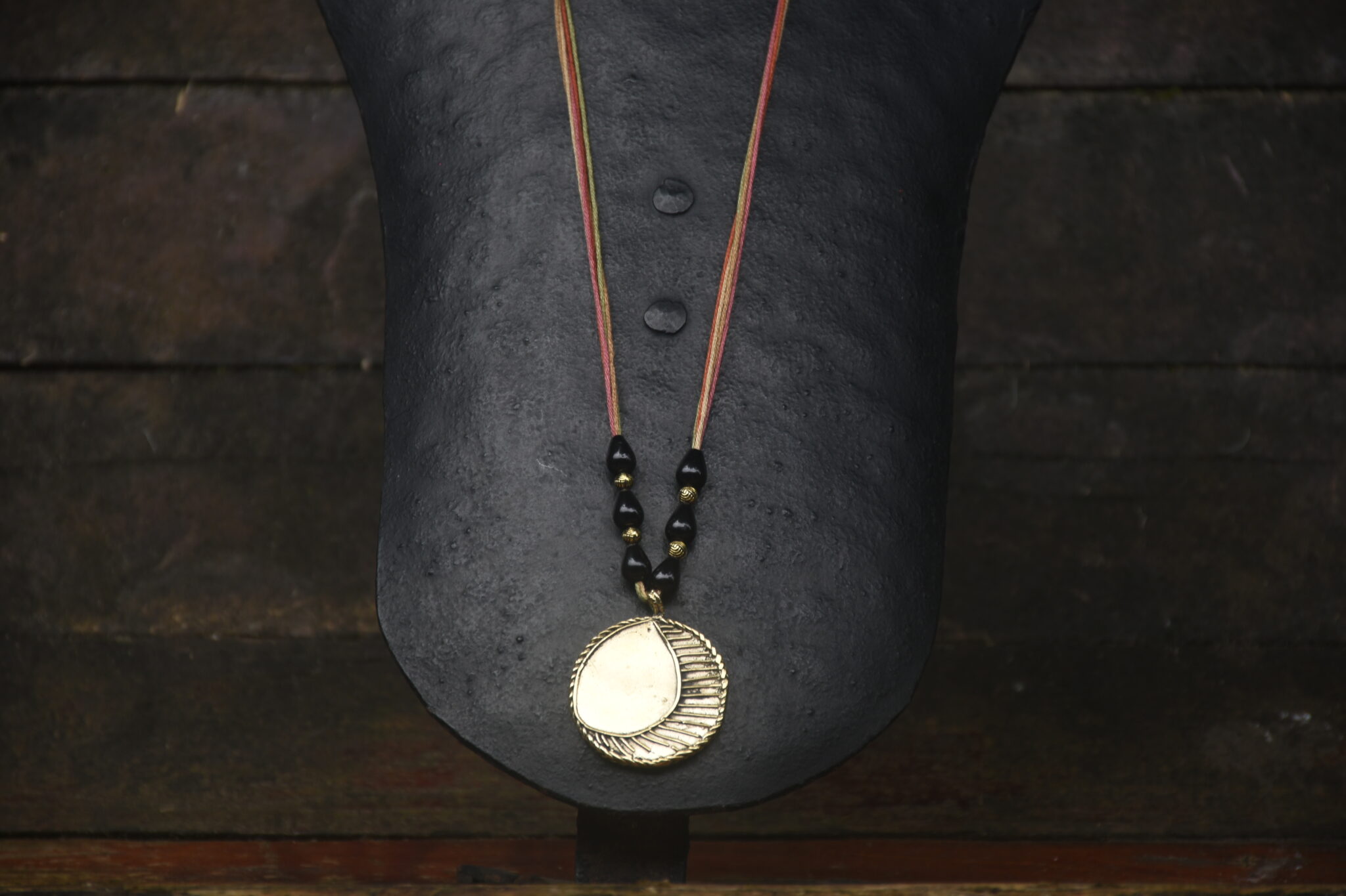 The necklace features a brass pendant made using the traditional Dhokra process, with a crescent moon form. This pendant is the threaded and decorated with beads to create a unique piece of wearable art.