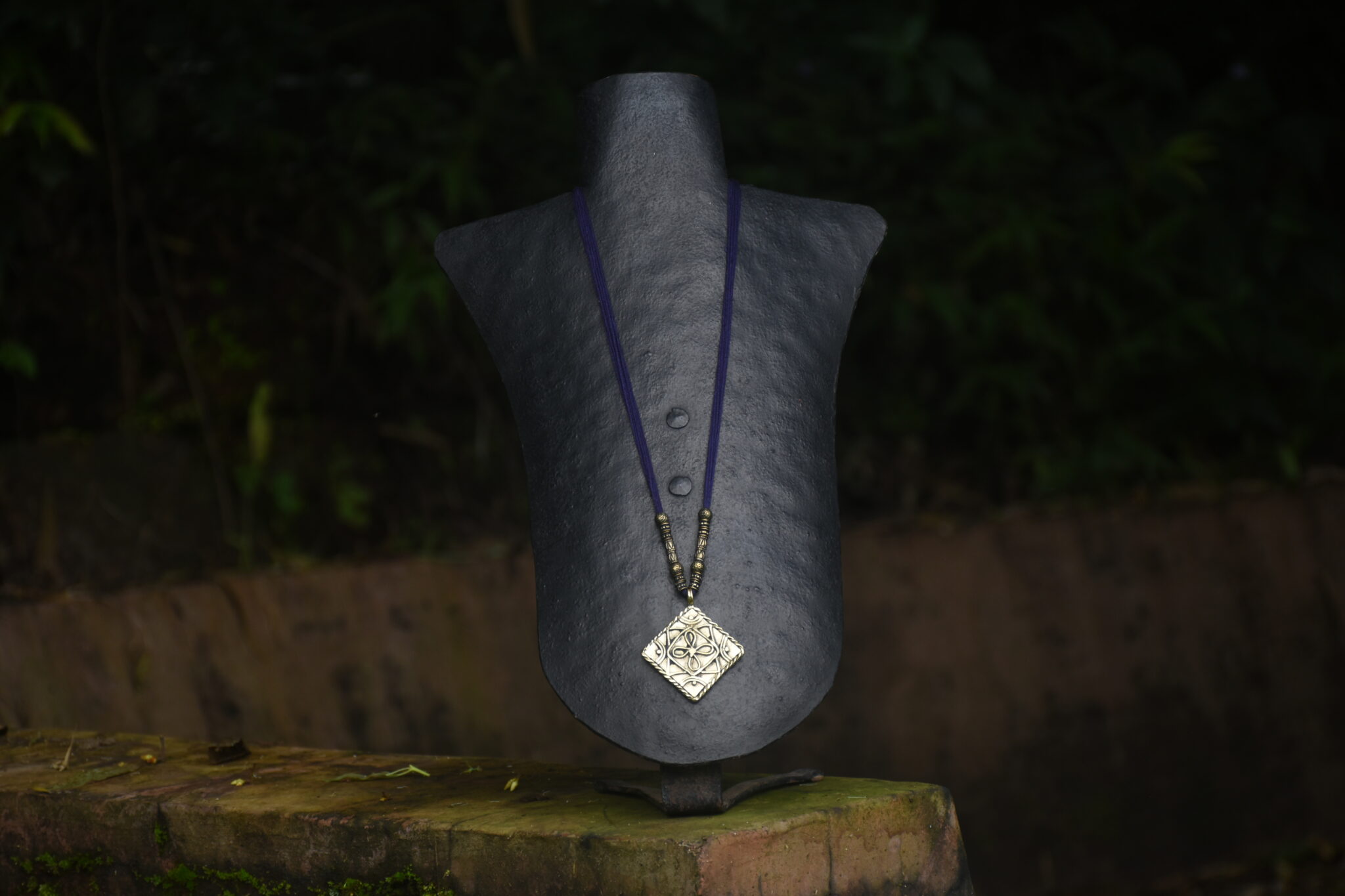 The necklace features a brass pendant made using the traditional Dhokra process, with a geometrical design. This pendant is the threaded and decorated with beads to create a unique piece of wearable art.
