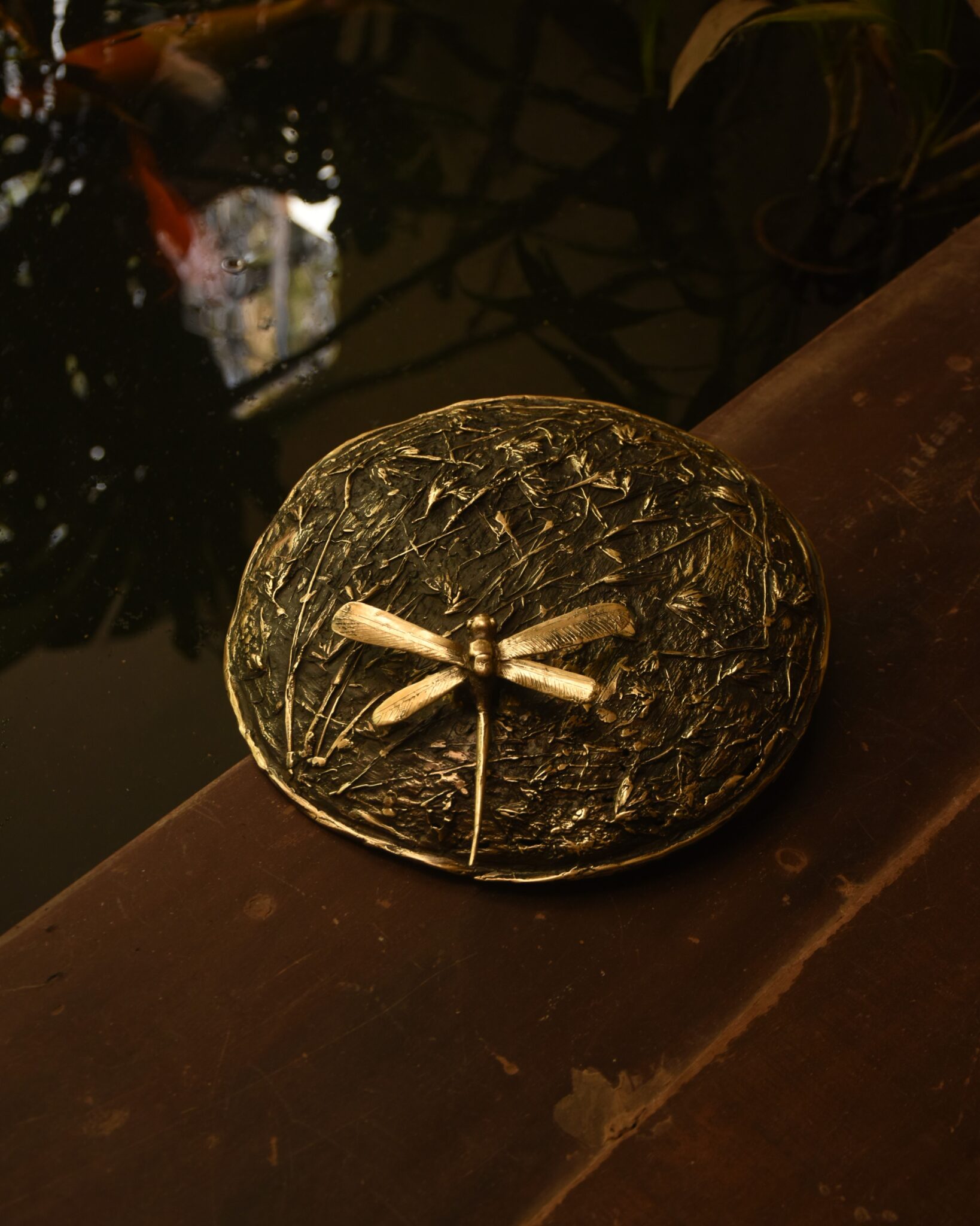 Organic casting is an evolution of the Dhokra process, in which organic material (like leaves, fruits, flowers, shells, twigs etc) along with wax work is cast in brass. Through this process we are able to replicate the patterns and textures in nature. This piece is fusion of the two techniques- background madeusing organic casting and the dragonfly made with the Dhokra casting method.