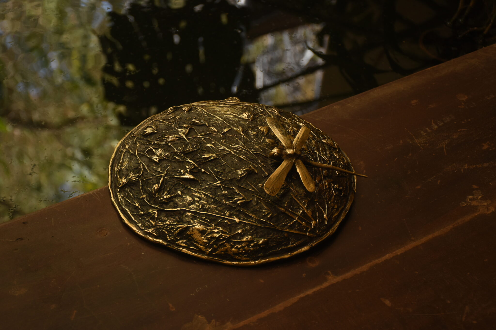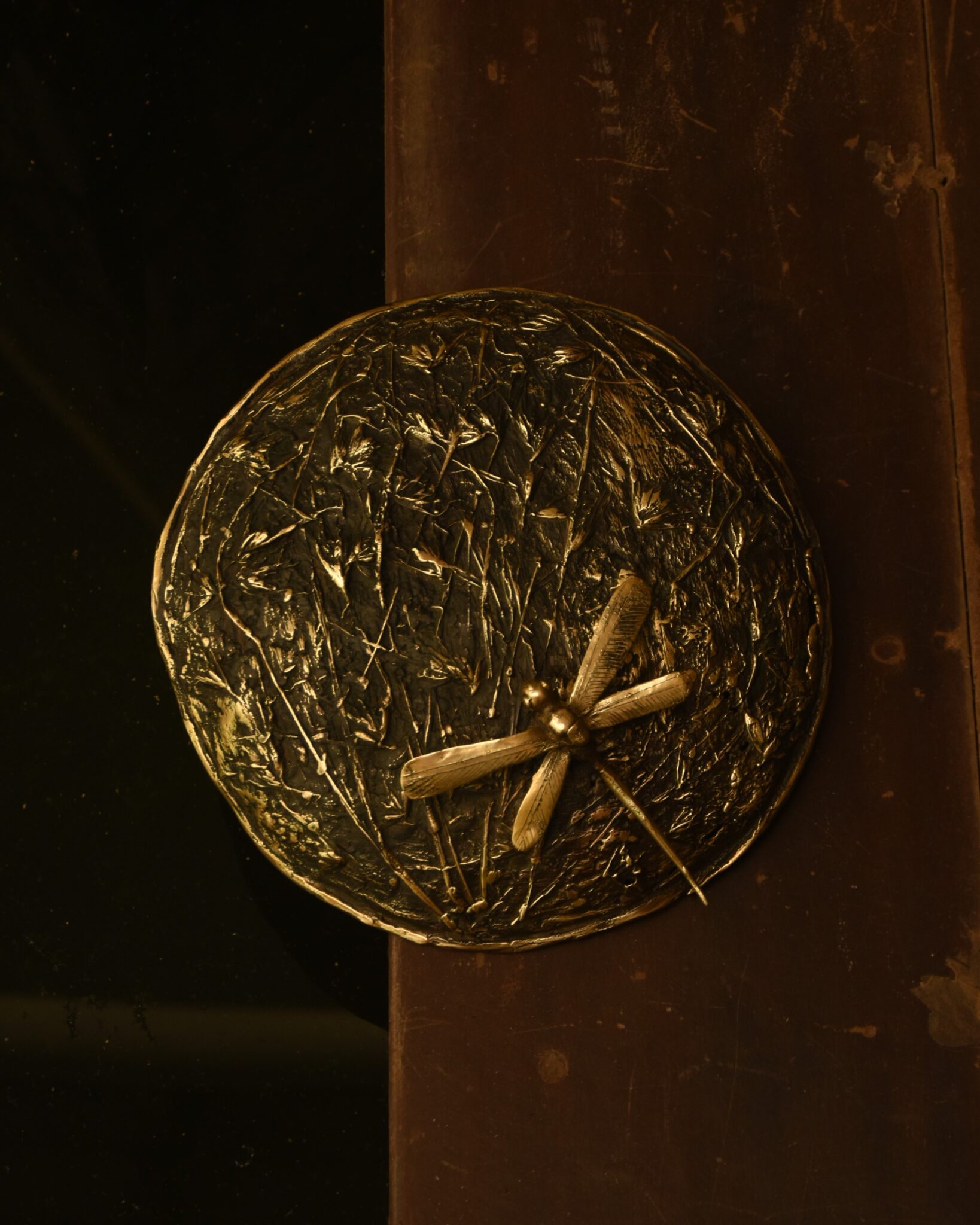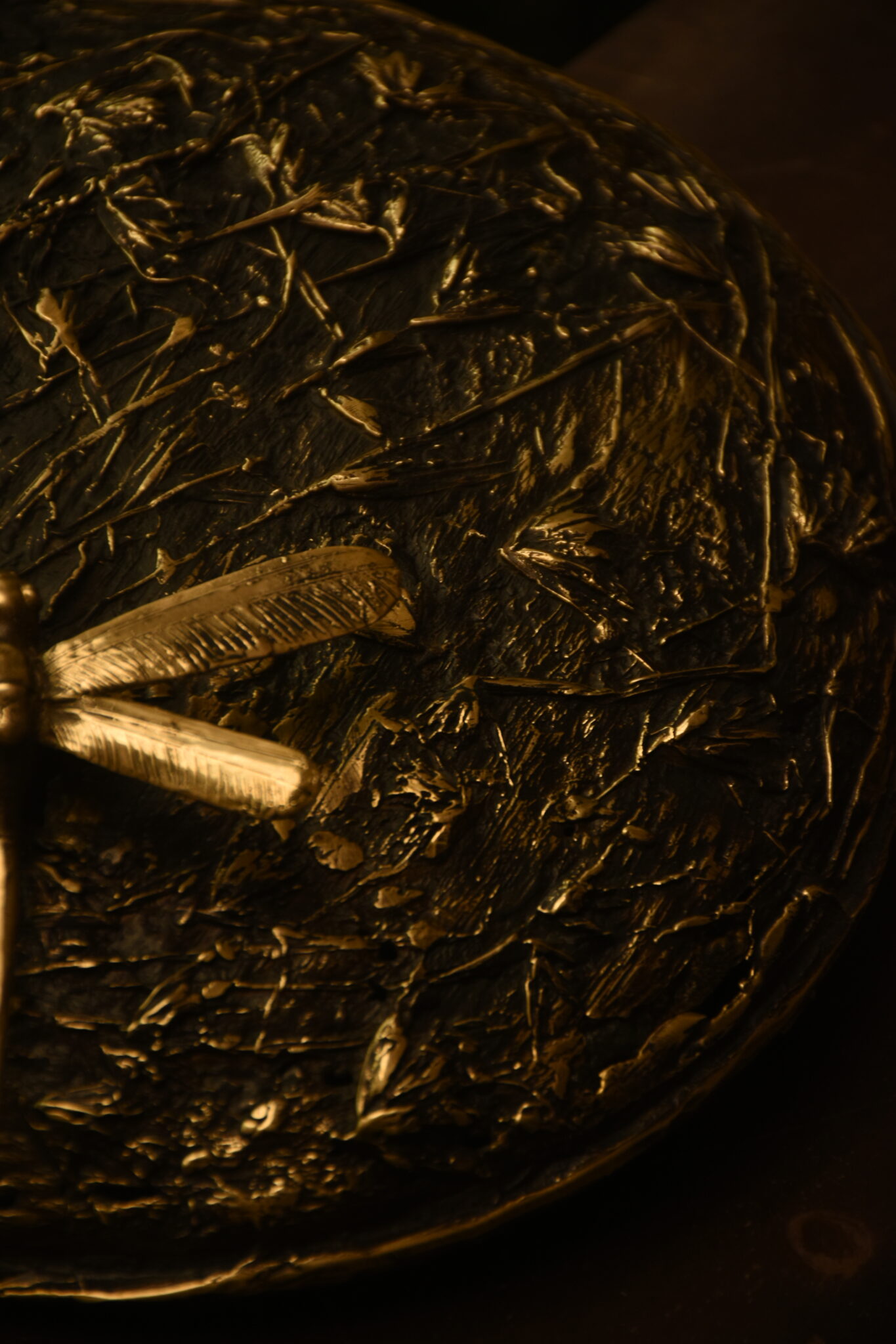 A circular brass wall art piece featuring textures created through the organic casting of wild grass and flowers. A brass dragonfly rests upon this natural tapestry, adding a sense of lightness and movement.