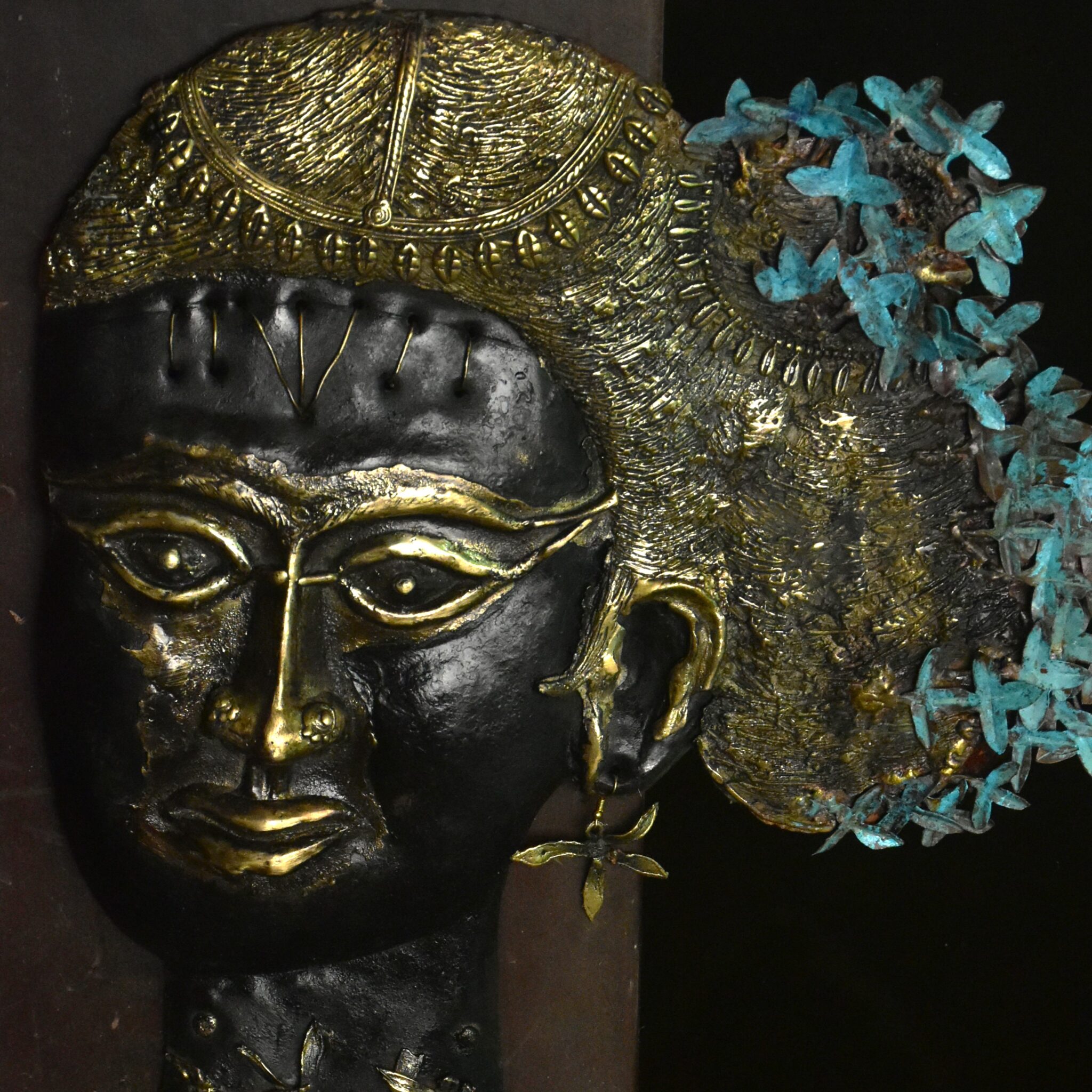 The entire piece is a fusion of iron and brass, combining the Beaten Metal Art and traditional Dhokra process. But the flowers in her hair are copper, with a fresh teal achieved through patination.