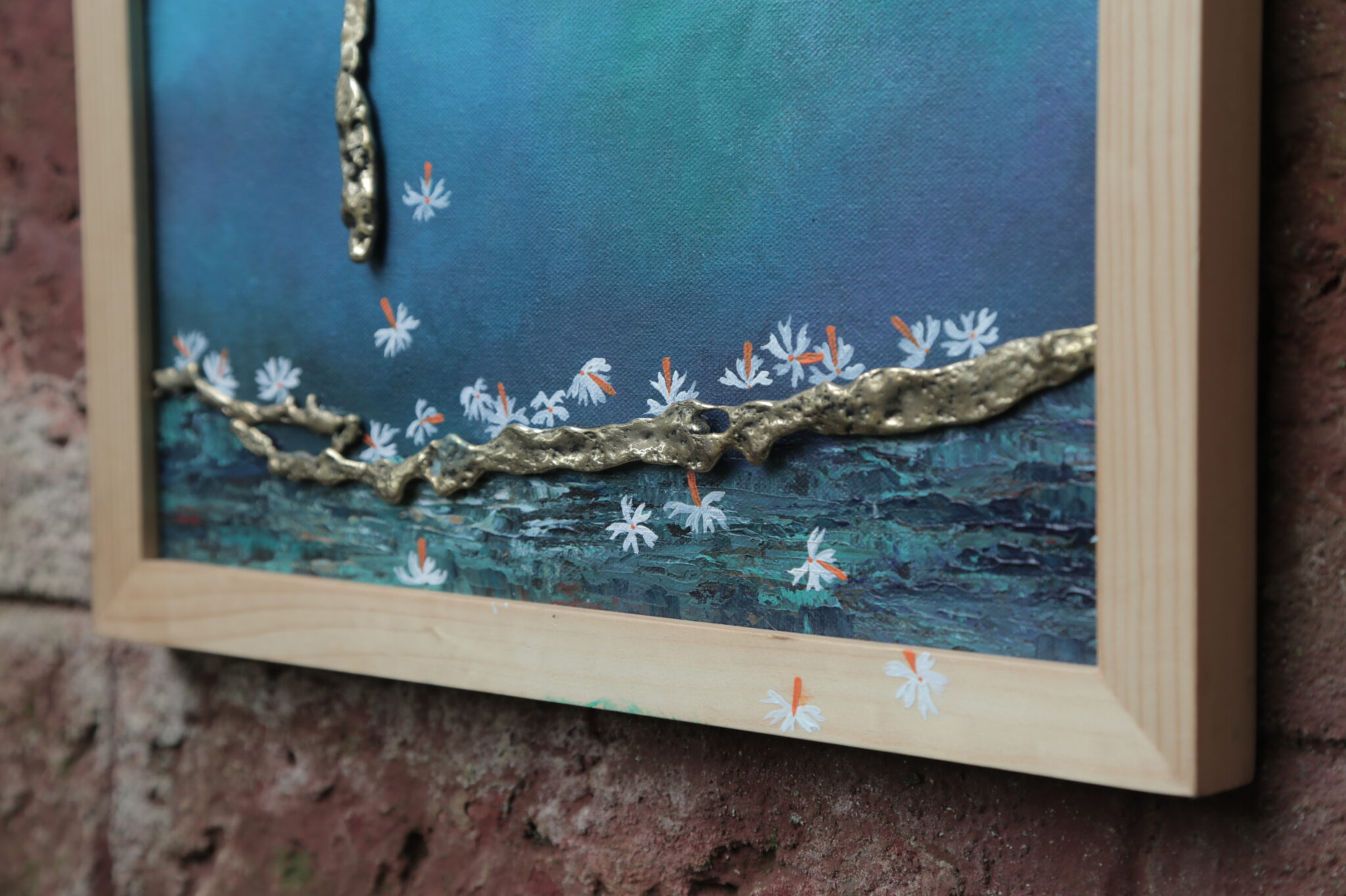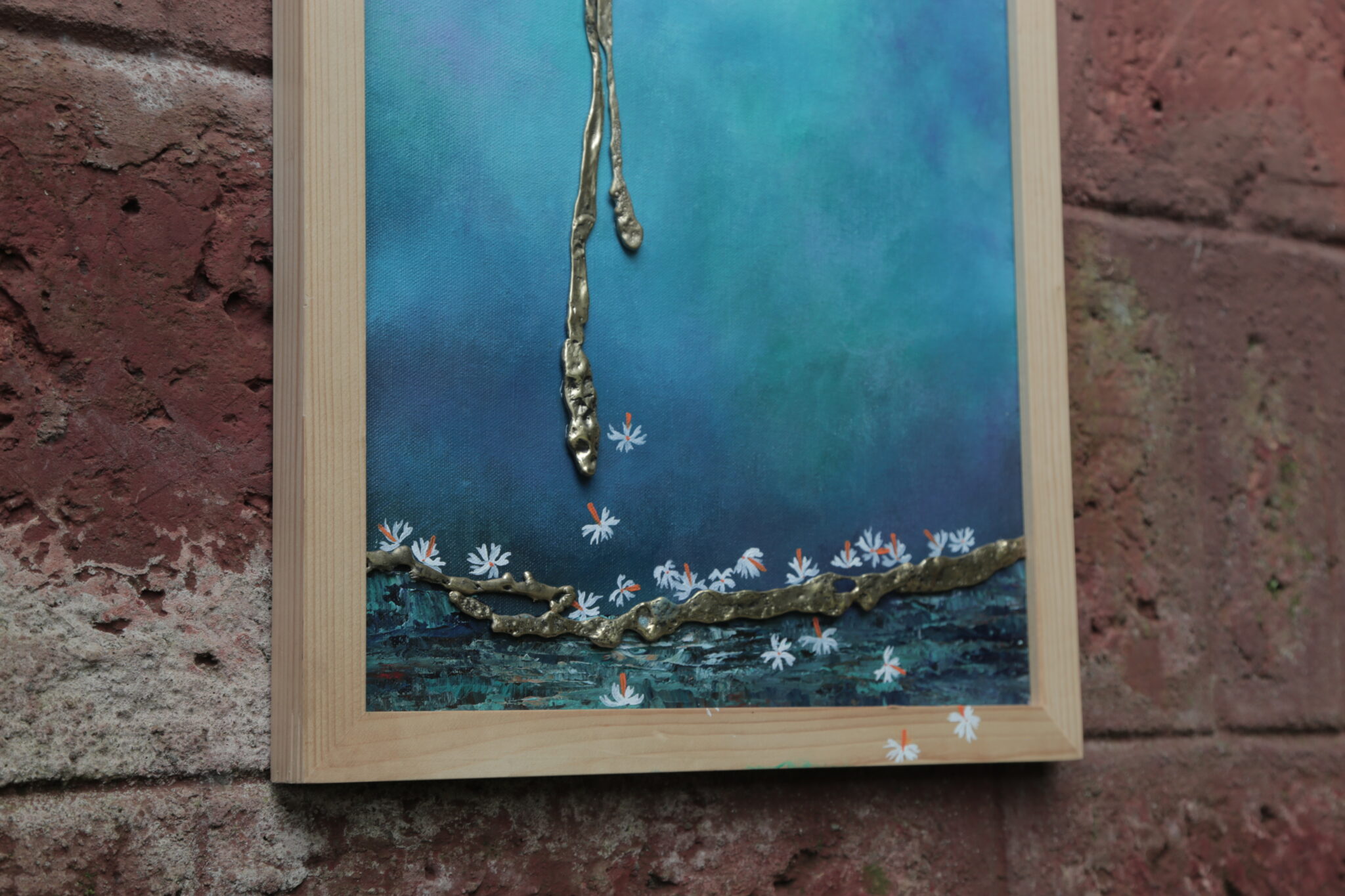About the Technique: The metal mural range is made using the molten brass poured on the ground to form abstract shapes. It is often a combination of these abstract shapes with some hand crafted or organic ones as an integral part of a painting on canvas. The painting is made using acrylic colours on canvas.