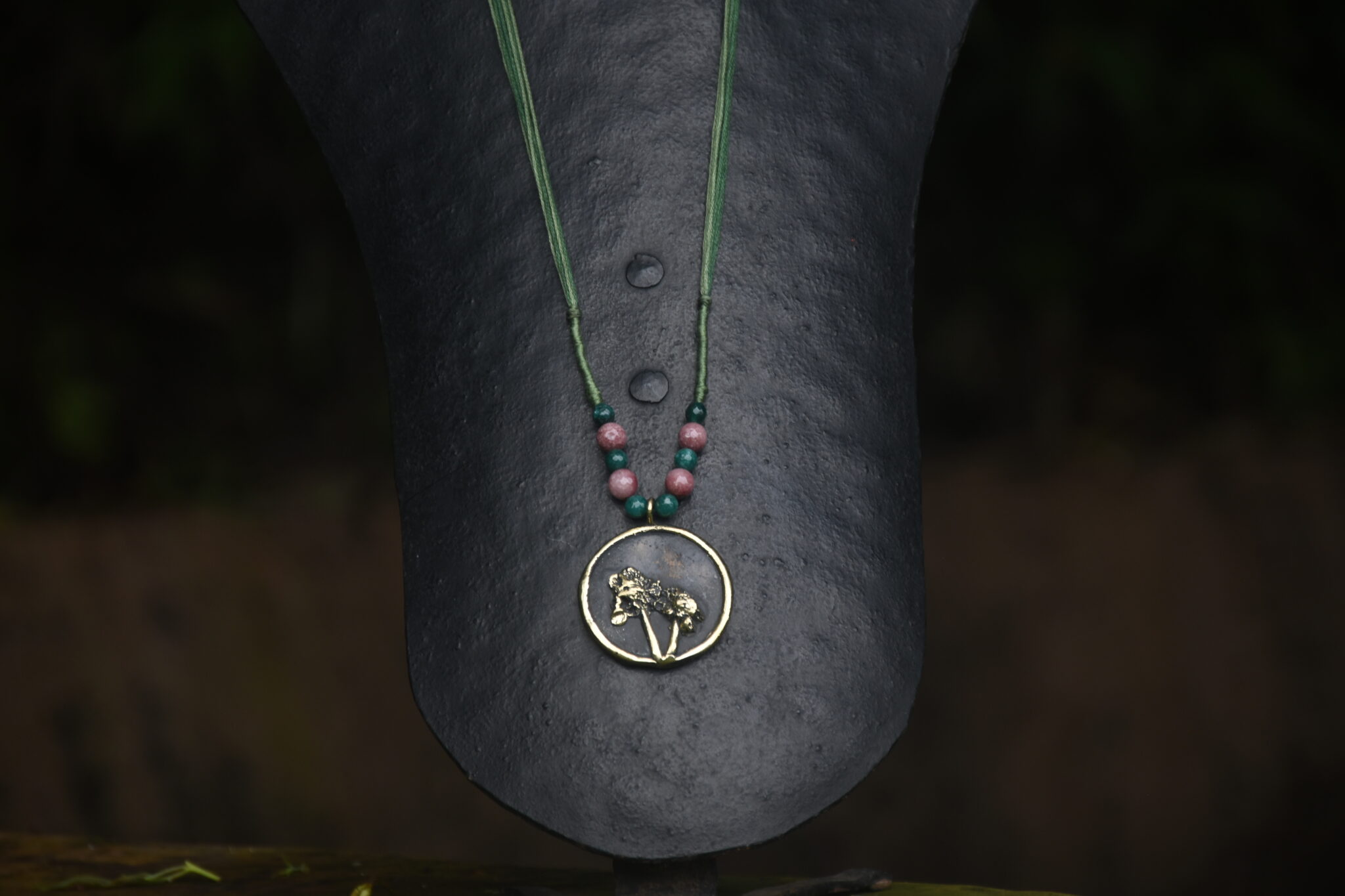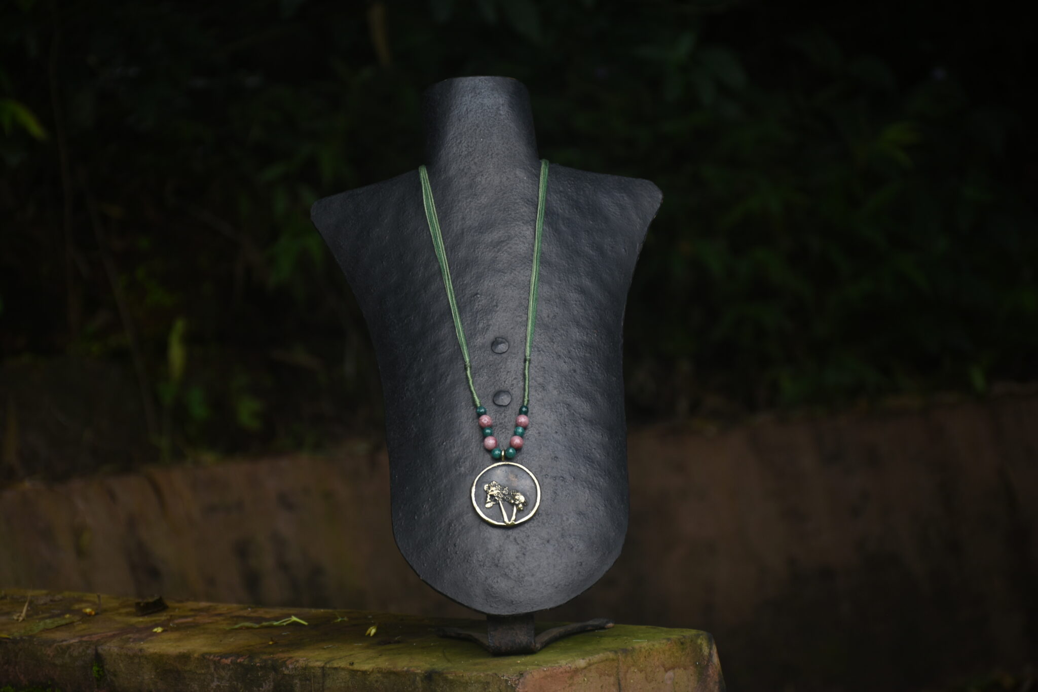 Jewellery Art is a great way to showcase all the unique metal casting processes we have developed at Devrai. This pendant features 2 such process – Organic casting and Fusion Dhokra. Small wild flowers were picked from our forest garden, composed on a terracotta tablet, and then they transformed into metal during casting, fusing with the terracotta base. After the pendant was made, the threads were added and decorated to complete the piece. The length of the threads is adjustable.