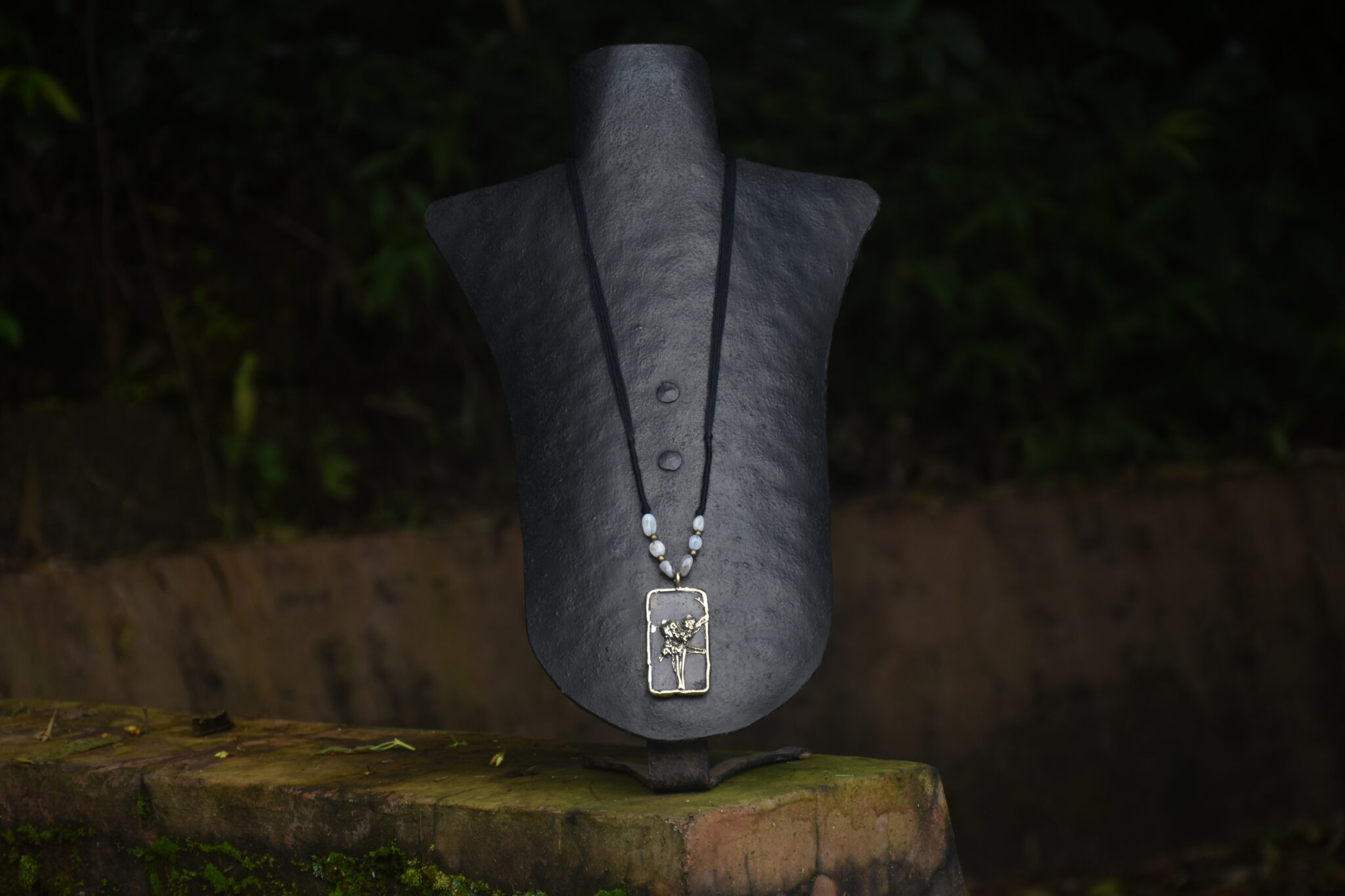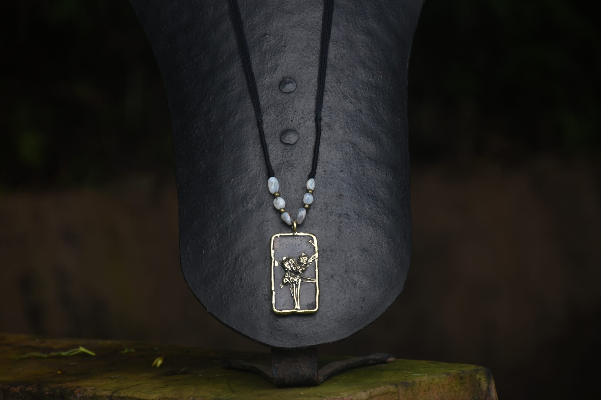 Jewellery Art is a great way to showcase all the unique metal casting processes we have developed at Devrai. This pendant features 2 such process – Organic casting and Fusion Dhokra. Small wild flowers were picked from our forest garden, composed on a terracotta tablet, and then they transformed into metal during casting, fusing with the terracotta base. After the pendant was made, the threads were added and decorated to complete the piece. The length of the threads is adjustable.