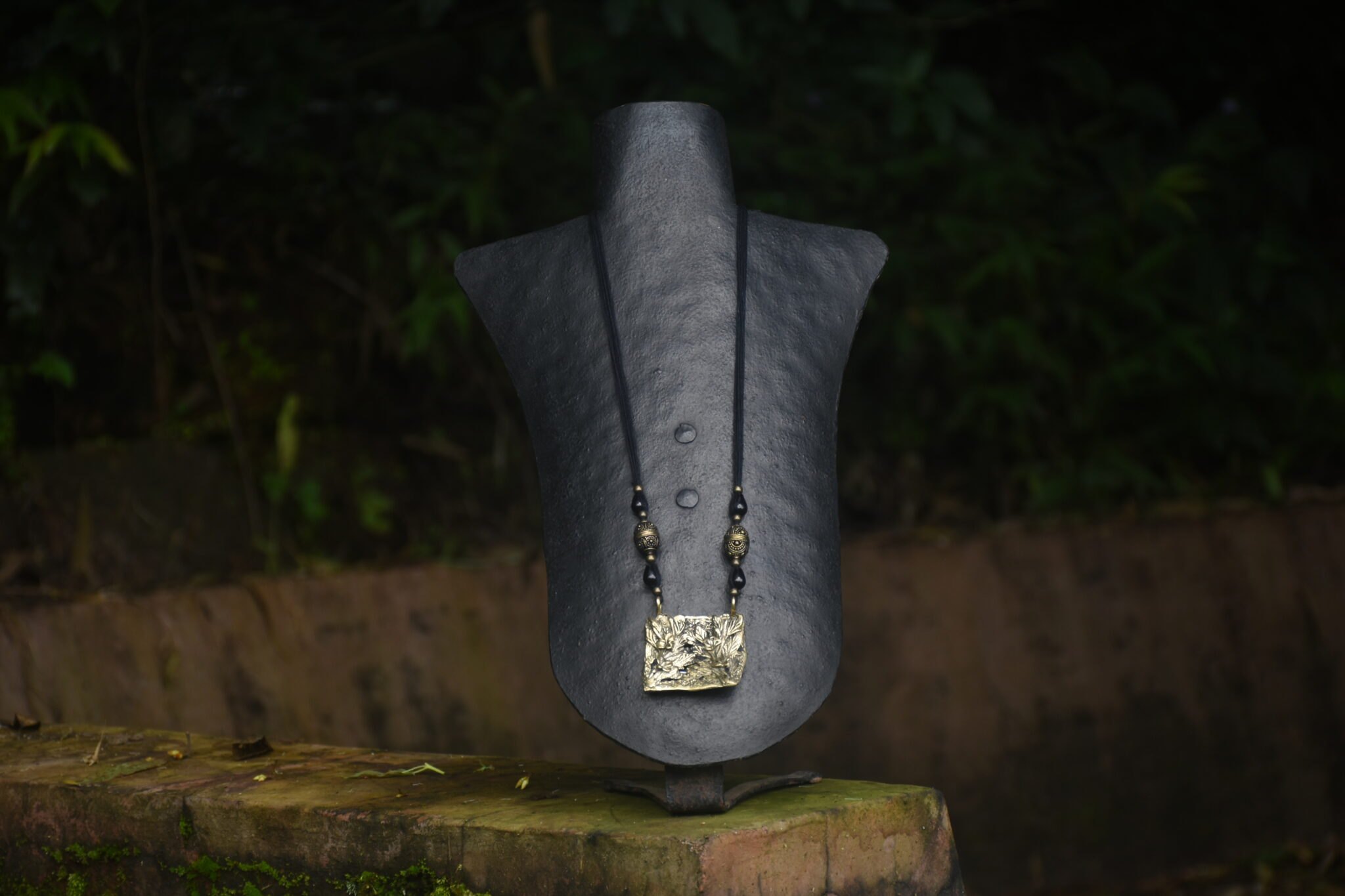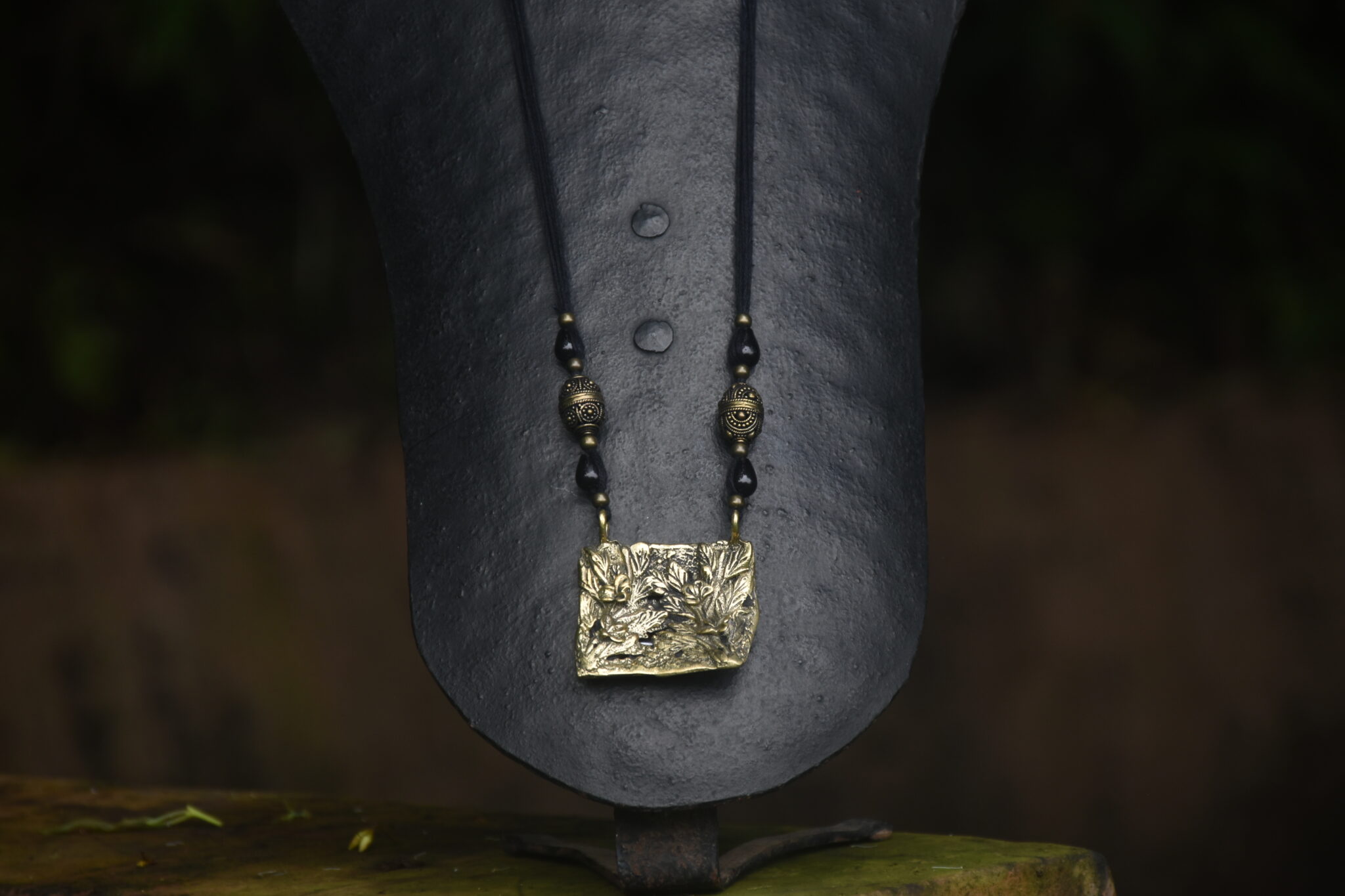 Nature is one of the main inspirations for our work at Devrai, but it also often becomes the very raw material for our work. This pendant was made using a rectangular cut piece of tree bark, its rough texture acting as the base for the flower motifs made on top with wax, all of which was together cast in brass. This is a blend of the traditional Dhokra work and Organic Casting. The pendant is threaded and decorated with beads and semi-precious stones to create this unique piece of wearable art.