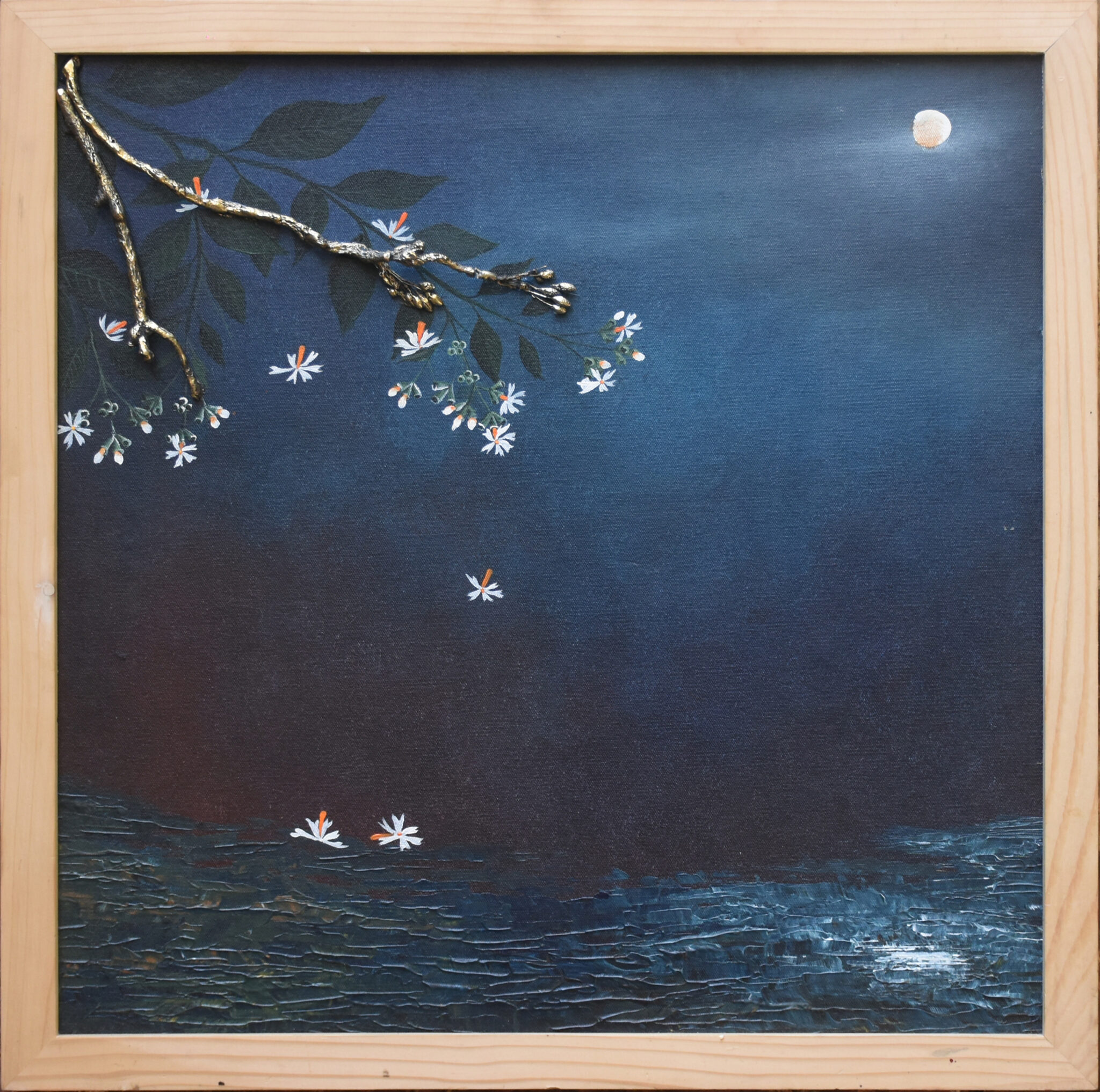 This painting evokes that fragrant night with the parijat flowers light by the full moon light, when the sun has just set but the last red glow remains..