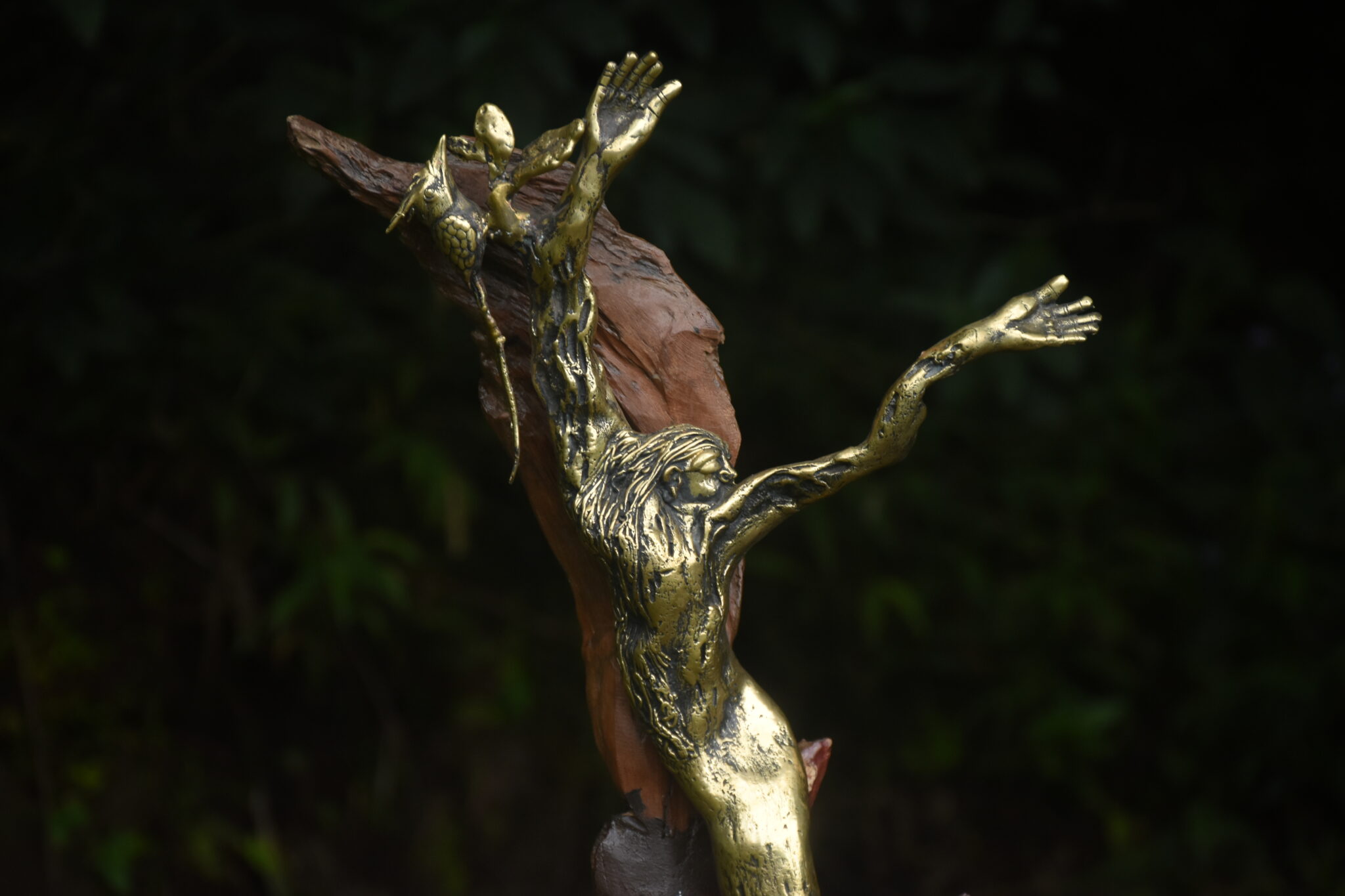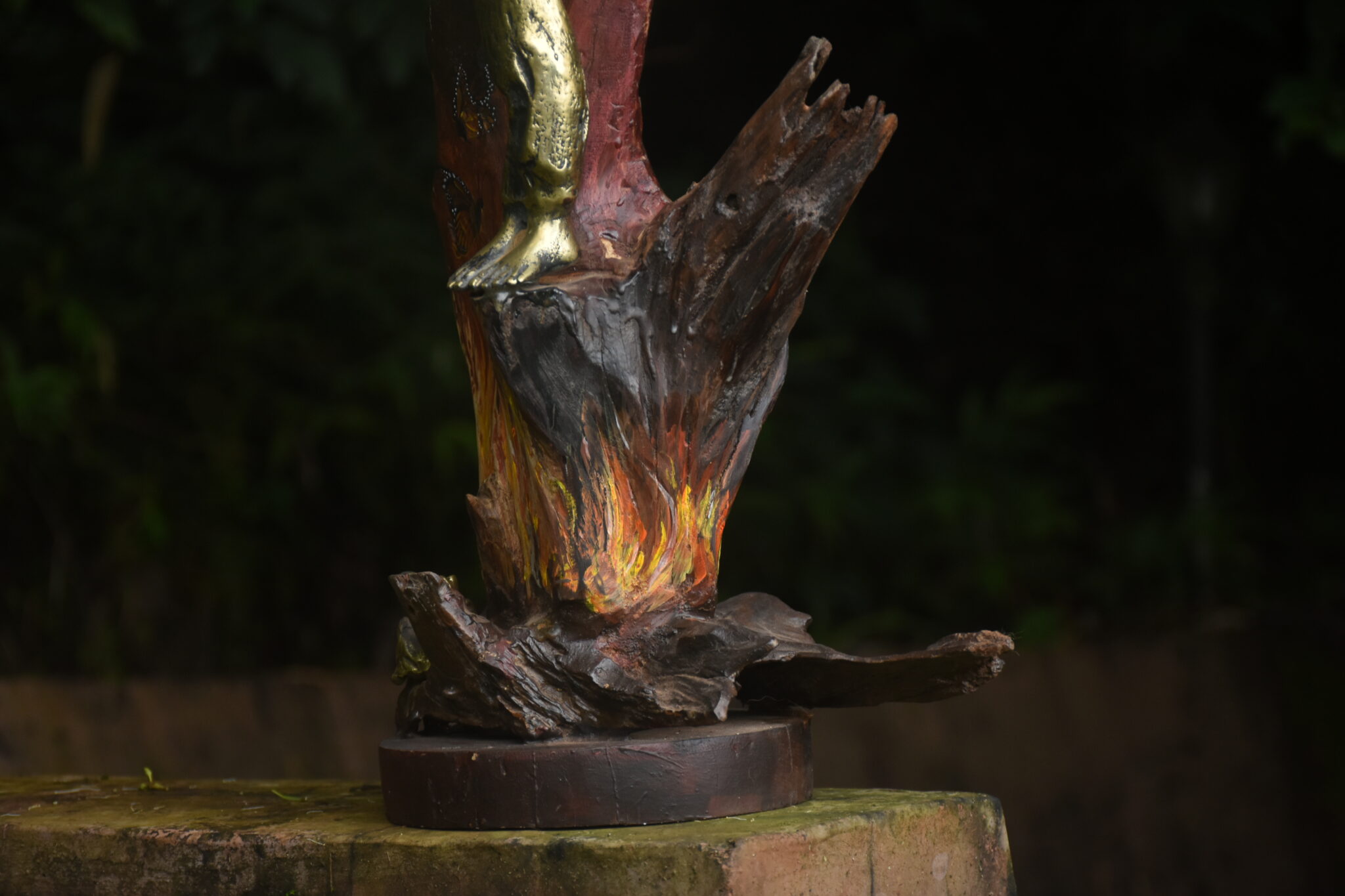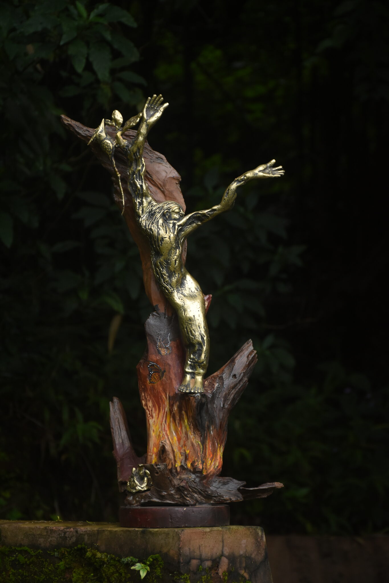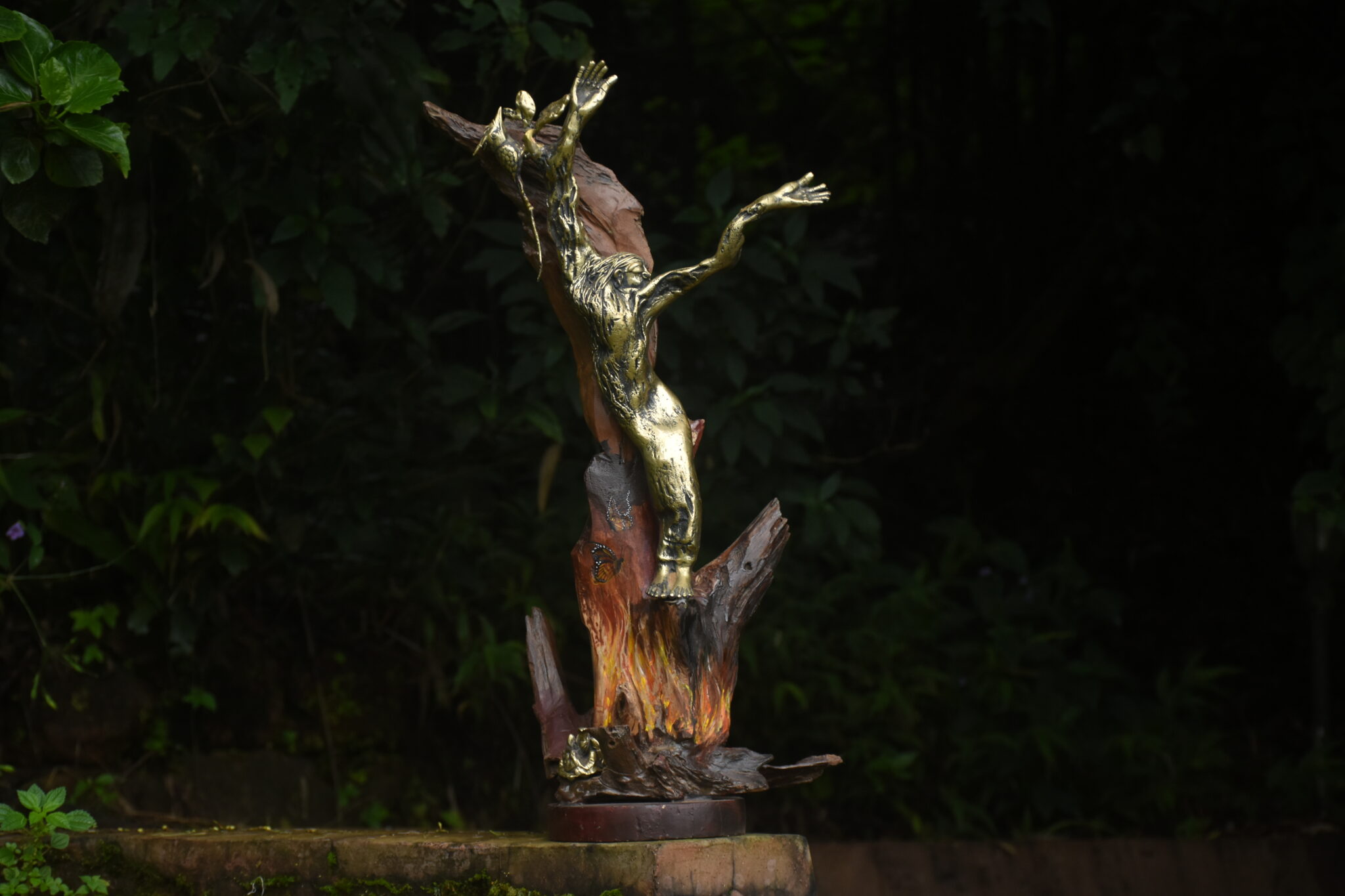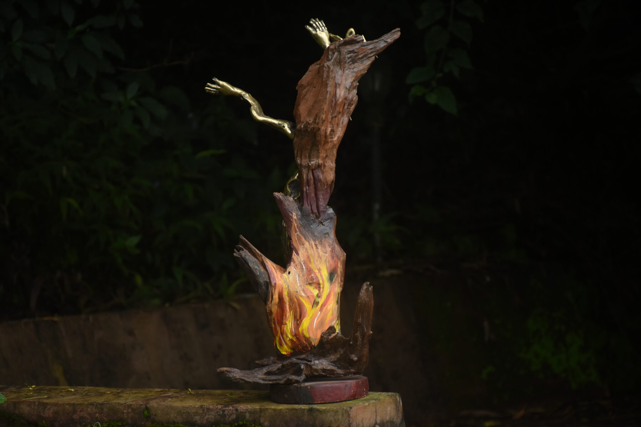Becoming the voice of silent nature through the medium of art is one of our guiding forces at Devrai. This sculpture shows the spirit of the forest being burned during Vanva (man-made forest fires in the Western ghats), and all the life going up in smoke. But the small butterfly in the midst of the fire stands as a symbol of hope.