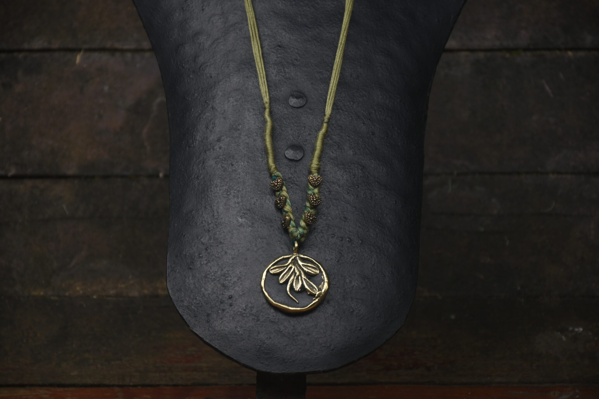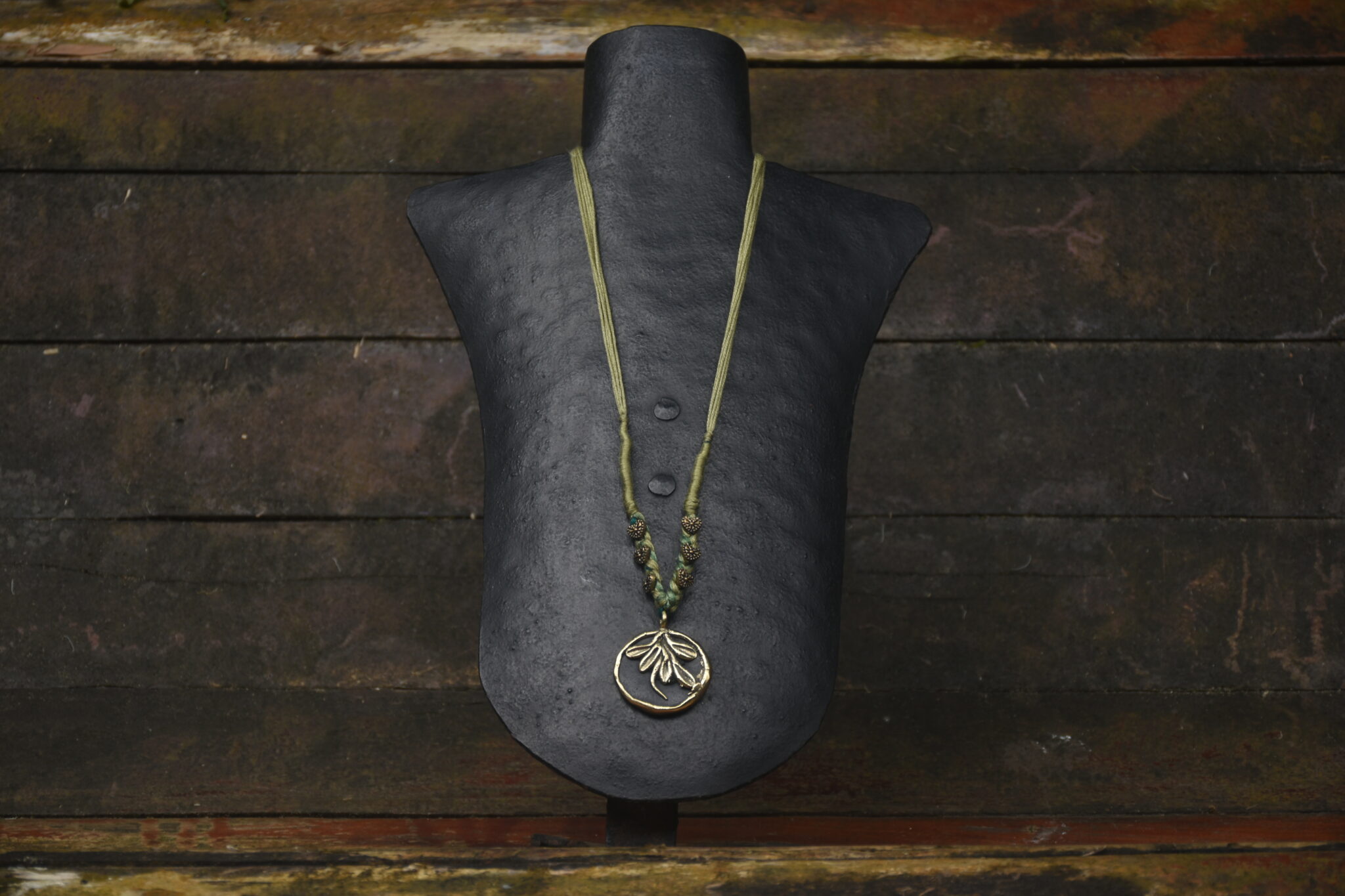 Even the smallest pendant made at Devrai goes through a long journey, and is worked upon at different stages by various members of our team. This is a piece from our terracotta and brass collection, in which the two materials are seamlessly fused in a unified whole. After the pendant is made, the threads are added, decorated with a mix of beads or semi-precious stones to complete the piece. The length of the threads is adjustable.