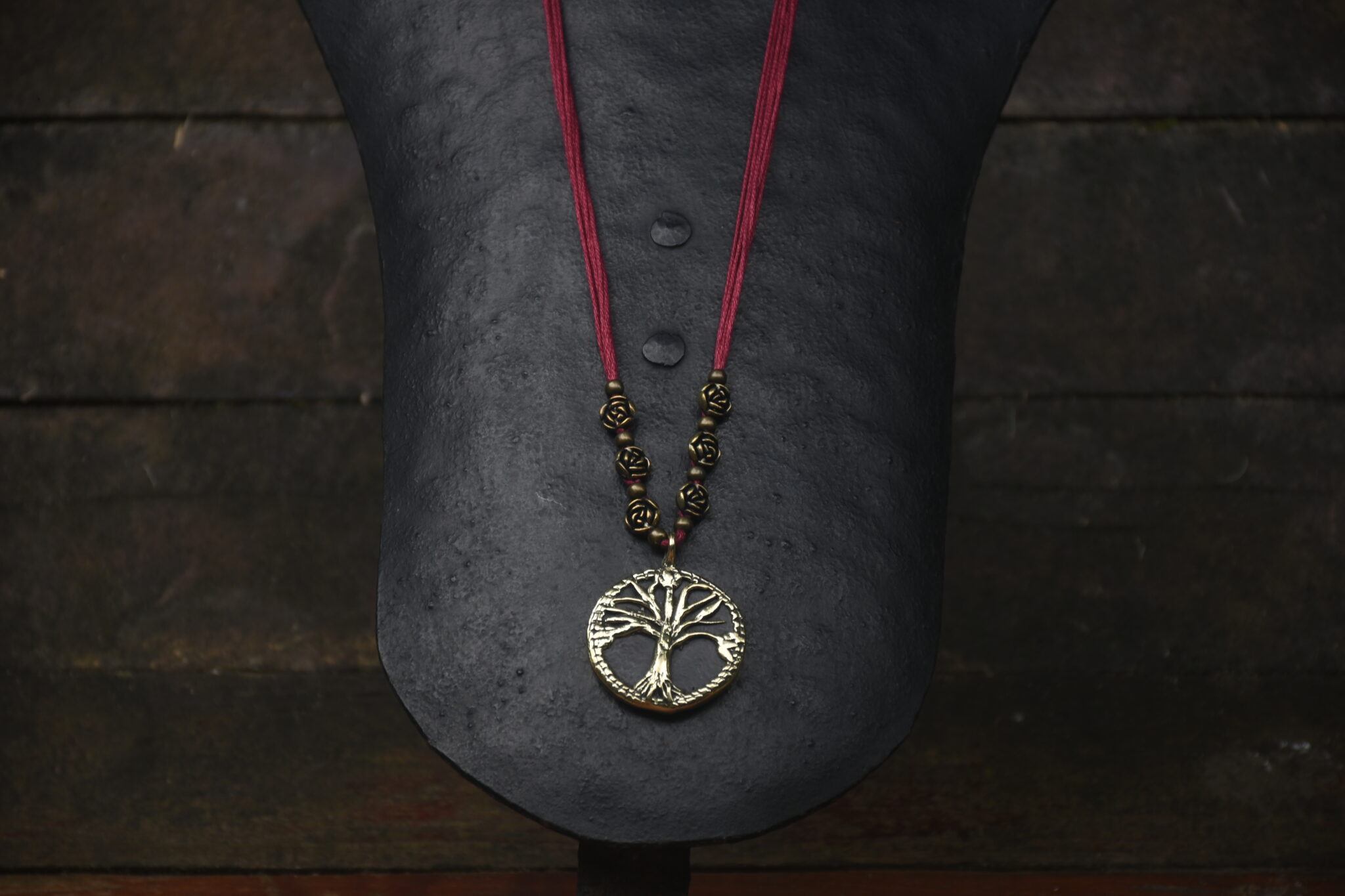 Even the smallest pendant made at Devrai goes through a long journey, and is worked upon at different stages by various members of our team. This is a piece from our terracotta and brass collection, in which the two materials are seamlessly fused in a unified whole. After the pendant is made, the threads are added, decorated with a mix of beads or semi-precious stones to complete the piece. The length of the threads is adjustable.