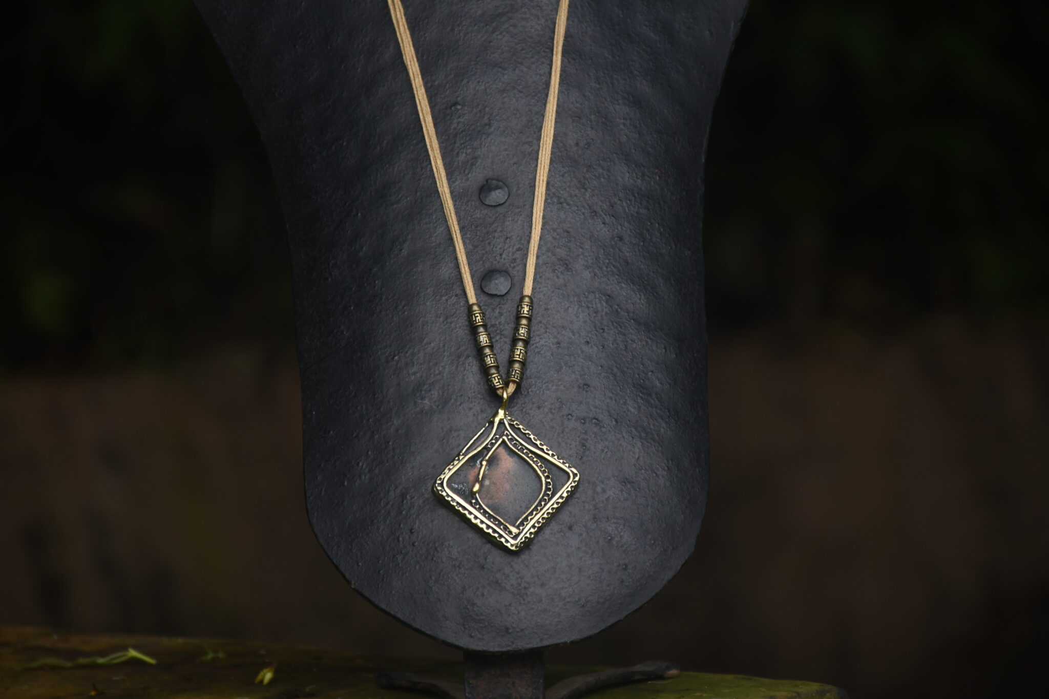 Even the smallest pendant made at Devrai goes through a long journey, and is worked upon at different stages by various members of our team. This is a piece from our terracotta and brass collection, in which the two materials are seamlessly fused in a unified whole. After the pendant is made, the threads are added, decorated with a mix of beads or semi-precious stones to complete the piece. The length of the threads is adjustable.